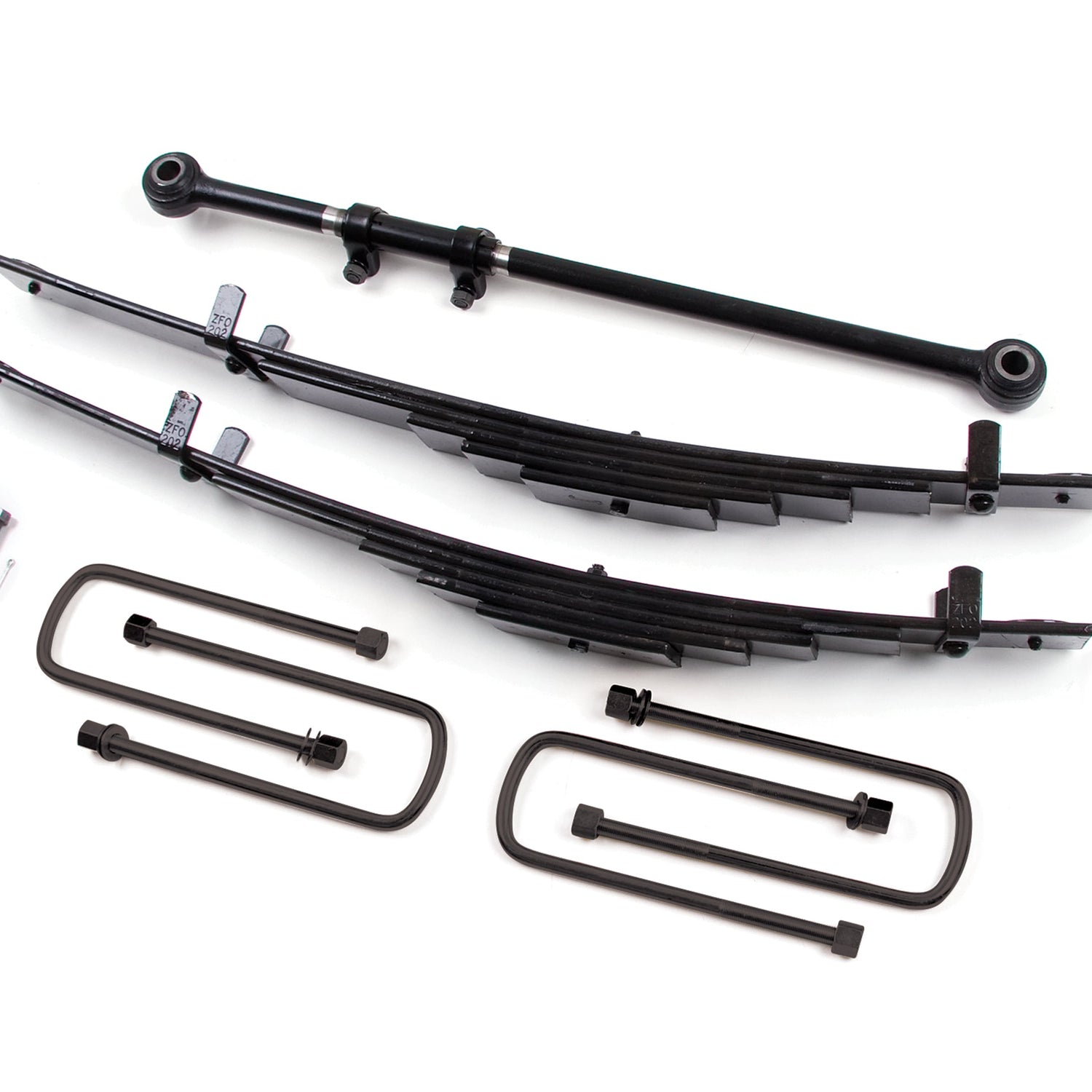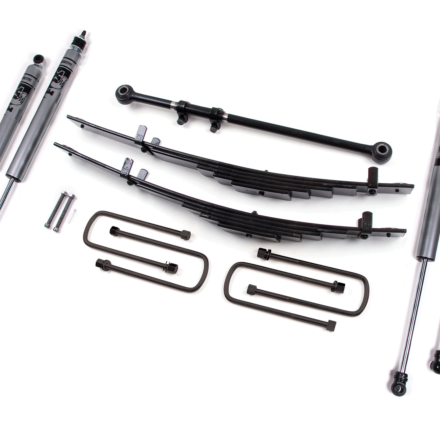 - Heavy-duty, adjustable front track bar re-centers front axle and adds strength.