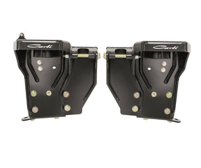 The factory Ford Super Duty coil mounts leave a bit to be desired in terms of fitting larger shocks for play and performance. Presenting Carli’s Dominator Coil Buckets, a duo of 1/4″ cold rolled steel that replace your factory buckets with expertly engineered mounting for larger 3.0″ shocks. These coil buckets bolt up to the factory mounting holes, allowing the vehicle to be returned to stock. Laser cut and CNC bent on computer-aided machines, these monstrous brackets are a necessary addition to extract more performance from your Super Duty.