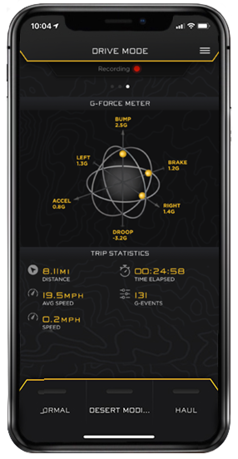 The IIC App brings all of this technology together by offering a user-friendly interface to monitor, record, and adjust the system’s performance via Bluetooth connection. Users can easily alter the shocks’ baseline settings for firmness, as well as adjust the sensitivity of vertical “G-Boost” and lateral “Corner Boost” with a few simple taps from their favorite iOS device. The App includes several preconfigured ‘Drive Modes’ (Normal, Desert, and Haul) but also offers the ability for users to create an unlimited number of unique presets using their own custom settings. To top it all off, you can record data from your trip including time, speed, distance and G-Forces for your very own ICONIC Overview.