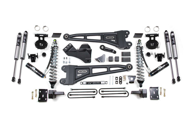 Built to outperform upgrade your 2008-2010 Ford Super Duty F250 and F350 diesel truck to the next level with this 6-inch radius arm lift kit with FOX coil-over conversion from BDS. Designed to improve stance performance and capability this kit includes everything necessary to set your truck up right with clearance for up to 37" tires.; Up front the lift kit includes diesel-specific FOX 2.5 coil-over shocks heavy-duty replacement radius arms forged drop pitman arm and track bar bracket for steering correction sway bar relocation brake line brackets and custom-tuned secondary FOX 2.0 Shocks.