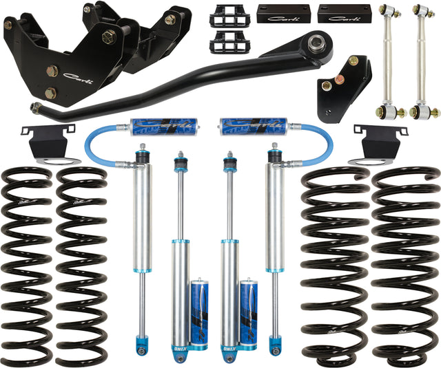 **This system will NOT be upgradeable to any other Carli Suspension Systems.** It’s designed to be a solution for customers wanting a quality, big-shock system boasting huge off-road capability, minimal lift and NO reduction in payload or hauling capacity. We recommend slight eccentric bolt compensation to correct caster after the lift as there are no Radius Arm Drops included. For this reason, customers may experience a slight bow in the coil spring. We did not experience a coil bow in any of our test trucks but it’s possible at the 2.5” lift height without a Radius Arm Drop Bracket. A Radius Arm Drop Bracket can be added to alleviate bow and recenter the caster adjustment if bow is encountered. This system will result in tight and responsive, sports-car like handling; the 3” Suspension Systems will ride softer in the rear given the included reduced capacity rear springs.