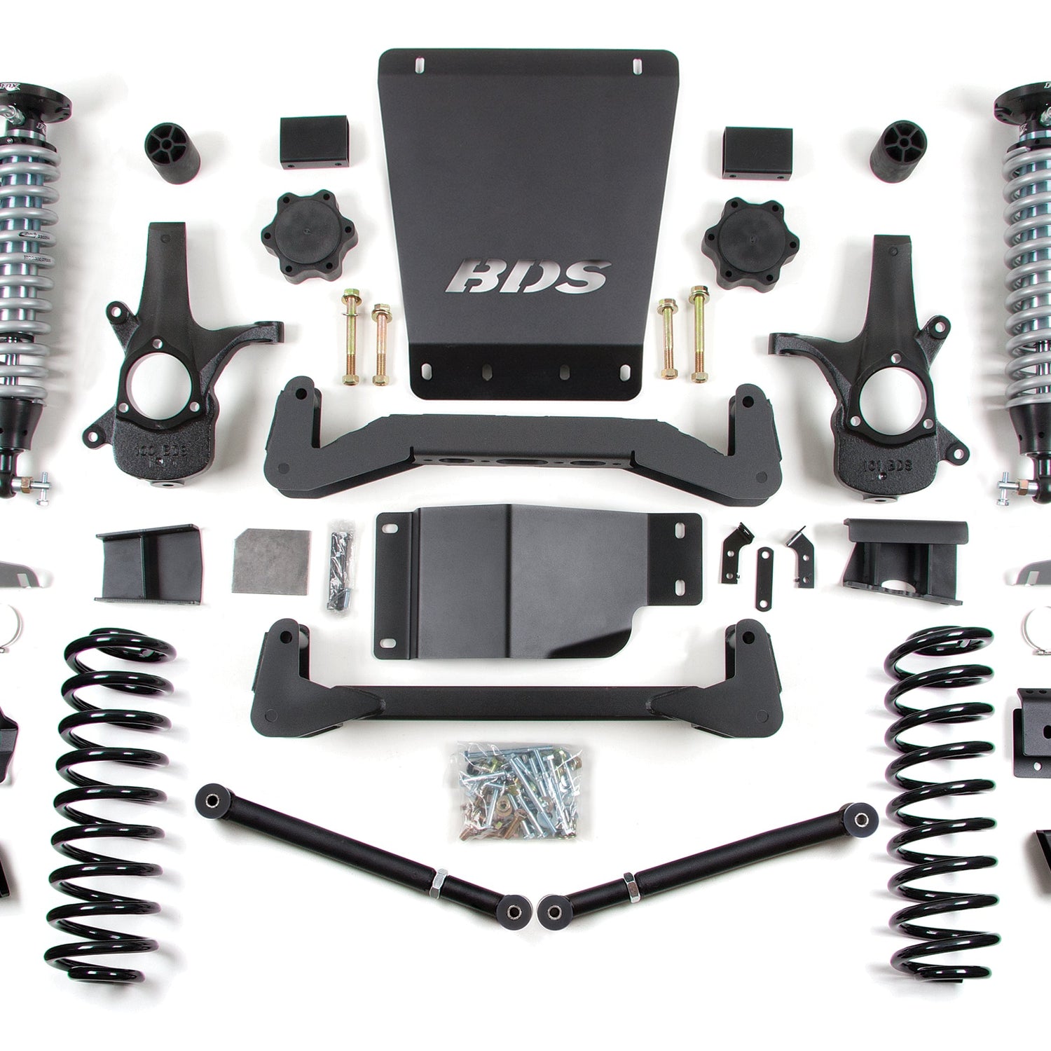 Upgrade the performance and capability of your 2007-2014 Chevy Avalanche, Suburban, or Tahoe and GMC Yukon 1500 with 6-inch coil-over suspension lift kit by BDS. These kits feature proprietary FOX 2.5 coil-over shocks designed specifically to bolt-on performance for increased travel and the ability to soak up the roughest terrain along with smooth on-road comfort. Designed to improve stance, performance, and capability, this kit includes everything necessary to set your truck up right with clearance for up to 35" tires