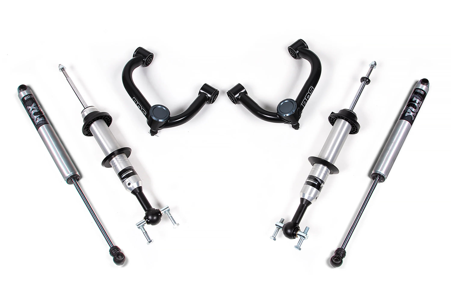 The BDS 2" Leveling Kit with FOX 2.0 Snap Ring Struts corrects factory rake, sharpens handling, and adds clearance for larger tires—without the harshness of budget spacers. FOX’s Performance Series snap-ring struts let you set ride height precisely while improving on-road comfort and off-road control.