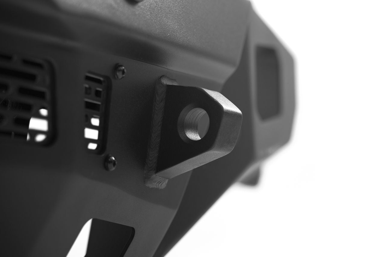 Our Spec Series Front Bumper features aggressive styling, and provides improved ground clearance without any cutting required. At the center of the bumper behind the satin black mesh panel is a light mount suitable for the DV8 Elite 20” Single Row, Rigid SR 20”, or Baja Designs S8 20” light bar. Additional supplemental lighting options are provided by dual 3-inch light pod mounts in each wing of the bumper. Recovery options for your truck includes 1-inch thick D-ring mounts that take ¾-inch shackles, and a hidden winch mount. OEM parking sensors retain full functionality with our compatible sensor cutouts. This front bumper requires no drilling or modifications and features a fully bolt-on installation.