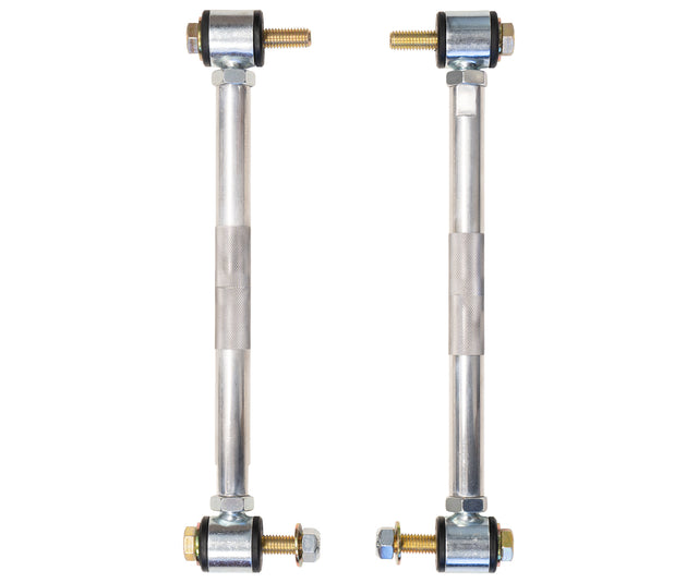 Keep your rear sway bar from binding through it’s extended travel stroke by ditching the factory links in favor of our Adjustable Rear End Links. They feature aluminum bodies for corrosion resistance, forged and zinc’d bushing housings, durable urethane bushings for long life, stainless steel crush sleeves, and left/right hand threads for easy on-truck height adjustment.