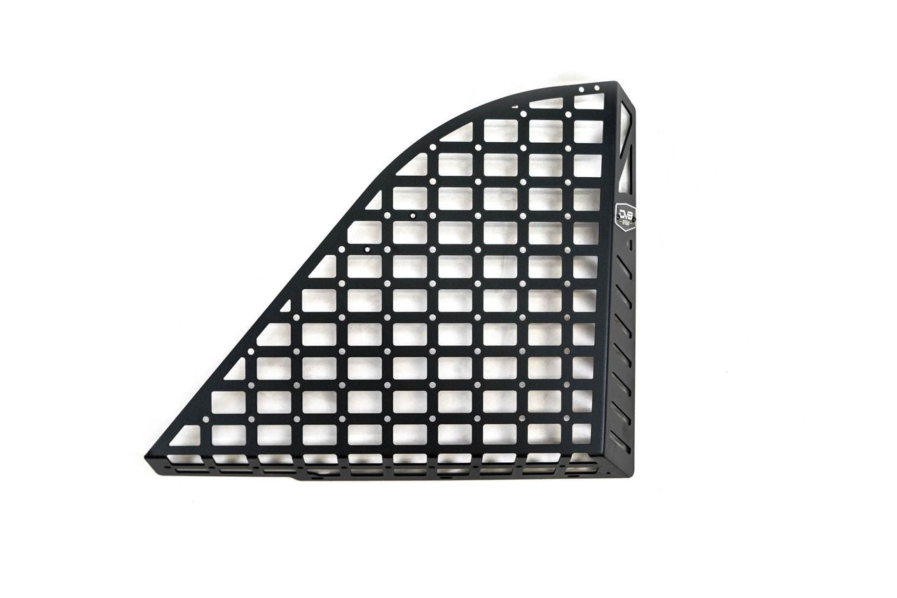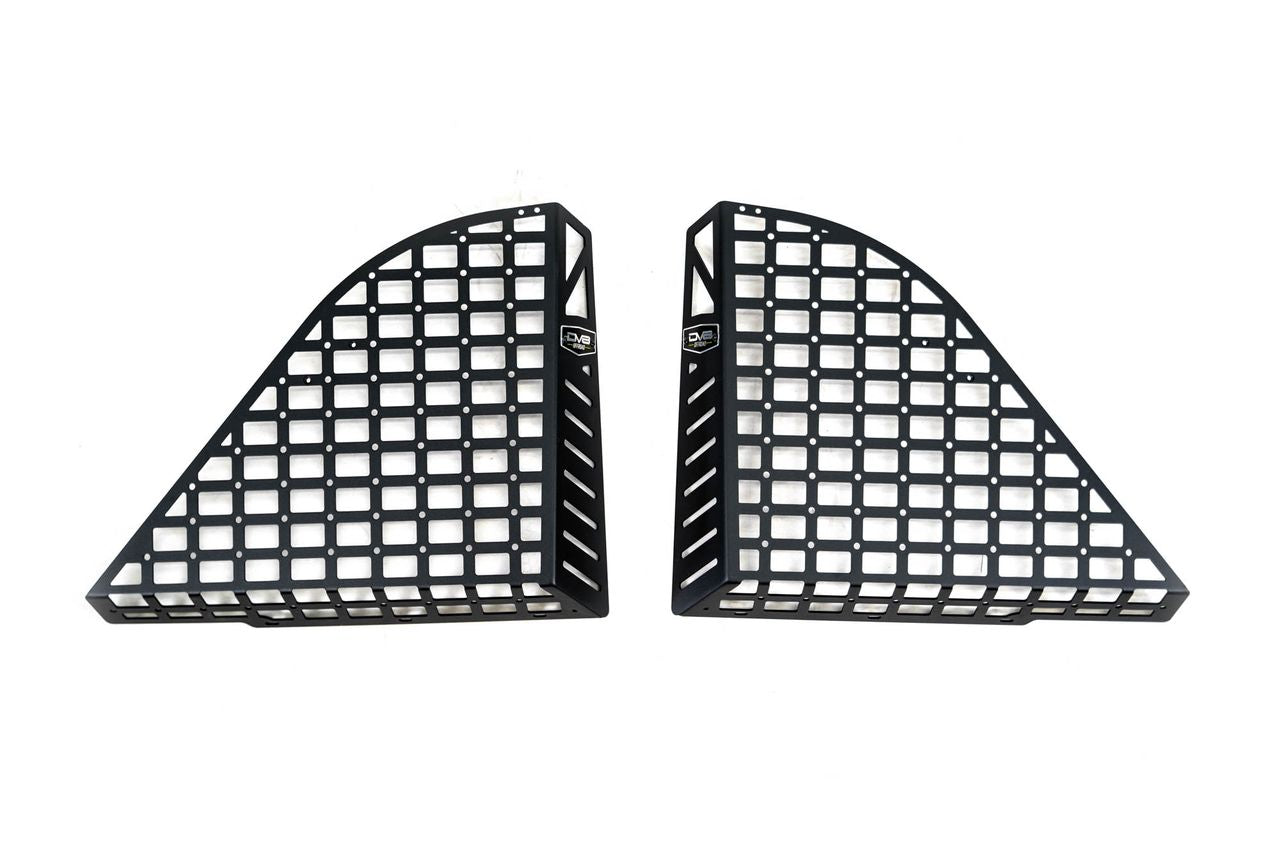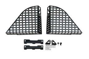 Our Molle Panels feature a pocketed design for mounting supplies on both sides, and you can use molle attachment systems for securing gear to the panels. The integrated M6 (1/4“) slots allow for carriage bolt mounting. The panels follow the shape of the windows, and they attach to multiple mounting points. The panels can be run with or without the hardtop, and they can remain installed when attaching or removing the hardtop. They are made from steel, and are finished in a micro-texture black powder coat. The panels are fully bolt-on.