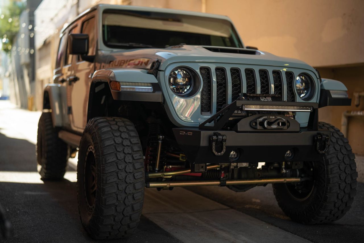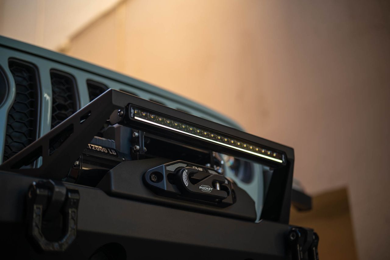 Our Light Bar can be paired with aftermarket or DV8 front bumpers. The bar features a flood and spot output. The accent light is made up of white and amber halo lights. The LED lights produce 8,820 lumens, and their lifetime is rated at 50,000 hours. The bar is made from a shatterproof UV resistant polycarbonate lens and an aluminum housing with a satin black powder coat finish. The light bar gives off a bright white (5700K) color. It features a driving and off-road mode. The light bar is IP 68 rated.