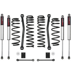 The Dynatrac Suspension 2" Lift System 2 for the 2018-Up Jeep Wrangler JL produces two inches of lift, the perfect amount to clear taller tires with zero cutting and zero rubbing. Get the bold off-road looks and capability you want without negatively affecting handling and ride comfort. The suspension system produces two inches of lift and easily accommodates 35-inch tires on Sport or Sahara models, and 37-inch tires on Rubicon models or other models equipped with high fender flares. The centerpieces of the kit are the Dynatrac coil springs and Dynatrac 2.0 EnduroSport Internal Reservoir shocks. Specifically tuned to the kit's Dynatrac springs, the 2.0 EnduroSport shocks are a high-pressure nitrogen design with internal reservoirs that features a 5/8-inch shaft, high-flow piston, and 6061-T6 aluminum construction for low weight and the highest possible heat dissipation and corrosion resistance. The front lower links included with this system are constructed from thick wall steel tubing, provide increased caster numbers, and feature dual durometer bushings for noise free operation, maximum articulation, and minimal bind. The kit also includes laser-cut brake line extension brackets, sway bar links, and bump stop extensions.