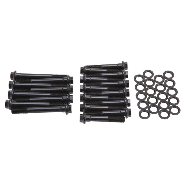 The Edelbrock #8503 bolt kit contain a complete set of the highest quality head bolts and hardened washers available. Cold-formed to ensure molecular integrity and heat treated prior to thread rolling and machining. Reduced diameter bolt heads eliminate the need for valve train removal to facilitate cylinder head re-torqueing. Hardened and parallel-ground washers are included. Rated at 170,000 p.s.i.