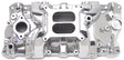 Edelbrock part #71011 Performer RPM intake manifold is designed for 1955-86 262-400 c.i.d. Chevy V8's, for maximum power and a broad torque curve for high- Performance'street/marine engines. Provides power like a single-plane and throttle response like a dual-plane. Has provisions to machine for an oil fill tube. No provisions for exhaust heated or stock-style choke. Accepts late-model water neck, air-conditioning, alternator and H.E.I. Will fit cast iron Chevrolet Bowtie heads, but will not fit 1987 and later cast iron heads. Intake manifolds will not fit under stock Corvette hood. This manifold offers a polished finish for a brilliant shine and classic look.