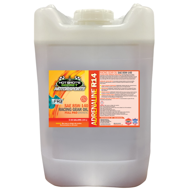 ADRENALINE® R14 85W-140 gear oil was formulated for the toughest applications in racing for a higher viscosity oil. The formulas are based on 100% pure poly-α-olefin (PAO) Group IV synthetic oil that requires a very small amount of viscosity improvers to meet the weight specifications. The infusion of our patented FR3 Nano Technology® and high zinc additive package extends the performance and anti-wear protection to levels unmatched by any other gear oil on the market. The result is a gear oil that has increased oxidation and thermal stability, deposit and sludge prevention, reduced oil breakdown, high wear resistance and longer drain intervals.