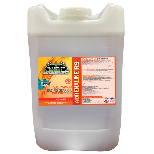 ADRENALINE® R9 75W-90 gear oil was formulated for the toughest applications in racing for a higher viscosity oil. The formulas are based on 100% pure poly-α-olefin (PAO) Group IV synthetic oil that requires a very small amount of viscosity improvers to meet the weight specifications. The infusion of our patented FR3 Nano Technology® and high zinc additive package extends the performance and anti-wear protection to levels unmatched by any other gear oil on the market. The result is a gear oil that has increased oxidation and thermal stability, deposit and sludge prevention, reduced oil breakdown, high wear resistance and longer drain intervals.