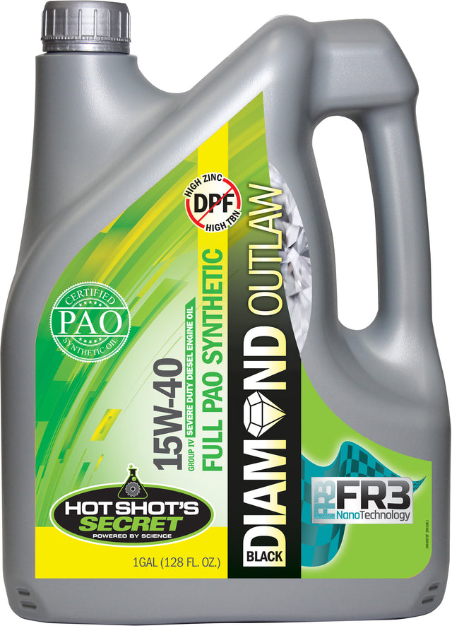 This unique Black Diamond Outlaw 15W-40 formula consists of a 100% pure poly-α-olefin (PAO) Group IV synthetic oil infused with patented FR3 Nano Lubricant Technology and CK-4 additive packaging. Black Diamond Outlaw can give you every benefit of the best PAO engine oil, including oxidative, thermal and molecular stability. Blue Diamond Outlaw even improves your oil's viscosity to help you meet weight specifications. With just one treatment of Black Diamond Outlaw, you can improve your oil's viscosity, performance and longevity to keep oil clean and grant you impressive mileage. Hot Shot's Secret Black Diamond Outlaw Oil is specifically formulated for heavy-duty off-road vehicles in construction, agricultural and industrial settings. Black Diamond Outlaw Oil lasts as much as three times as long as traditional CK-4 oils. The Hot Shot's Secret team understands how government mandates on CJ-4 and CK-4 oil have changed the game and reduced the robust qualities of many diesel oils. Formulas like Black Diamond Outlaw rise to the challenge of modern fuel regulations and give your engine an unparalleled boost with the power of zinc, dispersants and detergents alongside patented FR3 Nano Lubricant Technology. This formula has a TBN rating of nearly 15, meaning it exceeds CK-4 specifications by 150%. To use Black Diamond Outlaw Oil, add it to heavy-duty equipment that requires increased TBN and protection. When used alongside your scheduled oil analysis program, Frantz Bypass Oil Filter and Hot Shot's Secret TBN booster, your oil can last you for up to 100,000 miles. Black Diamond Outlaw Oil is not designed for use in vehicles that have catalytic converters, DPF, DGR or other emissions equipment that could potentially be damaged. Always make sure to change your oil filter per your manufacturer's recommendations.