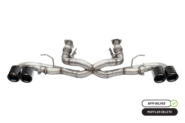 CORSA Performance AFM Only C8 Exhaust with 4.5 in. Carbon Fiber Flat Cut Black PVD Tips. The refined Track Series Exhaust. Like the CORSA performance C8 Track Series exhaust, this system is made for drivers seeking an ultra-aggressive exhaust note without resonance caused by 4 cylinder economy mode operation . CORSA's AFM Only C8 cat back exhaust systems is designed to eliminate restrictions, maximize weight savings, and bring the noise while eliminating resonance from 4 cylinder mode. Each system has been Track-Tested and Dyno proven to maximize performance producing up to 19 HP and 16 LBS Ft. of TQ. All while shaving 25 pounds from the stock exhaust system.