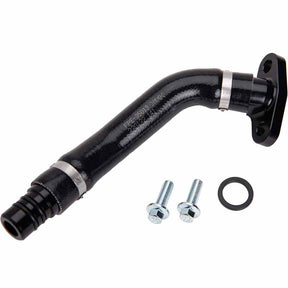 Eliminate the installation headaches associated with a non-flexible OE drain line with our ALL NEW silicone hose drain tube kit. This turbo drain kit is designed for use with all 6.7L Cummins equipped Dodge Ram factory VGT turbochargers and aftermarket drop-in replacements like our Cheetah Series. Featuring a larger ID smooth silicone hose and black anodized billet aluminum fittings with integral O-rings, our patent pending drain hose simplifies turbocharger installation and will ensure proper oil drainage from your turbocharger.