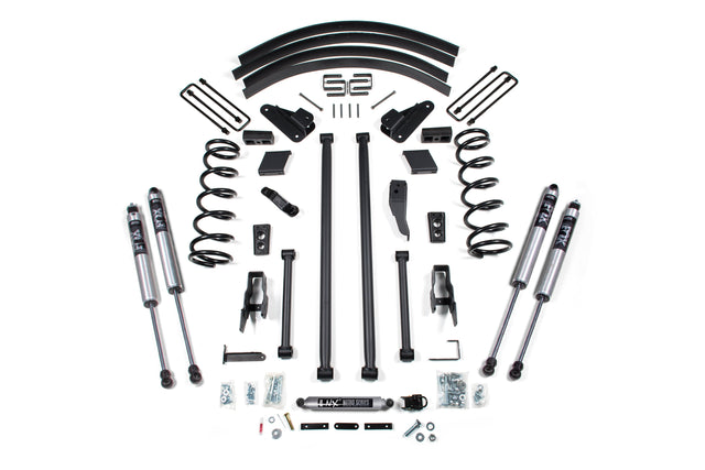 The 4-Link long arm system maintains the factory triangulation of the arms, adding to the overall stability of the suspension system. The front of the lift kit includes diesel-specific Pro-Ride coil springs, all four control arms, a mounting bracket, forged drop pitman arm, and a track bar bracket for steering correction, as well as bump stops, sway bar drop brackets, and precision-tuned NX2 or FOX 2.0 nitrogen charged shocks. In the rear, the kit