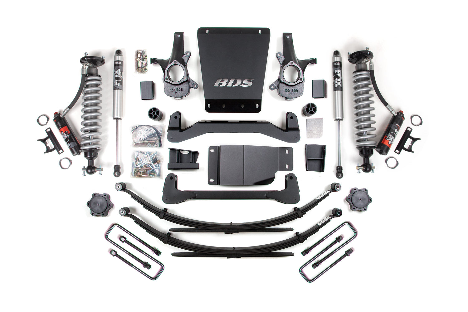 In the rear BDS offers both replacement lift block and full Glide-Ride leaf spring options to lift and level that stance. The lift block installs in place of the stock block and retains ride quality and load capacity. Also for the rear are new u-bolts, brake line brackets and precision tuned NX2 Nitro or FOX 2.0 Performance Series shocks.