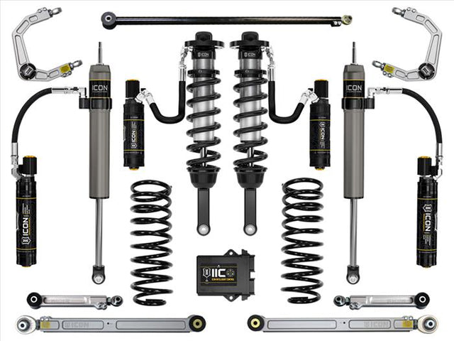 ICON 2010-2024 Toyota 4Runner suspension systems are designed with maximum performance and the serious driver in mind. ICON engineers primary focus is to increase wheel travel and damping ability, which translates into outstanding vehicle control and ride quality both on and off-road. This Stage 9 system includes vehicle-specific tuned, extended travel 2.5 coilover shocks featuring CDEV equipped remote reservoirs for exceptional cooling properties and ICON-engineered coil springs for superior vehicle feel through the range of travel. Focus on driving and let ICON Intelligent Control (IIC) read the terrain and make near-instant adjustments via the Compression Damping Electronic Valve (CDEV) at each individual shock. Control the system wirelessly through the IIC app on your phone and once configured the system functions without driver input. These coilovers are also height adjustable for 0-3.5 of front lift over stock, allowing the use of larger, more aggressive wheel and tire combos. Billet aluminum Delta Joint upper control arms not only add strength and durability but help retain factory alignment specs and offer on-vehicle caster/camber adjustment,. ICON billet aluminum adjustable rear upper and lower links are made from CNC machined 6061 aluminum and anodized for corrosion resistance. These link arm kits feature PTFE-lined FK rod ends and greaseable polyurethane bushings for increased suspension articulation, reduced deflection, and on-vehicle link arm length adjustability. ICON rear coil springs deliver on-road comfort and superior off-road performance with 2 of rear lift height over stock for a level stance front to rear. An adjustable rear track bar is included to provide proper rear axle alignment, improve articulation, and ensure fitment on KDSS equipped 4Runners. The 2.5 Aluminum Series CDEV remote reservoir rear shocks larger diameter offers outstanding performance off-road and a smooth ride on the street with active, adjustable compression damping.