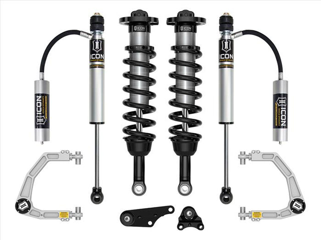 ICON Vehicle Dynamics 2024-2025 Toyota Tacoma suspension systems are designed with maximum performance and the serious driver in mind. ICON engineers primary focus is to increase wheel travel and damping ability, which translates into outstanding vehicle control and ride quality both on- and off-road. This Stage 3 system includes vehicle-specific tuned 2.5 Series coilover shocks featuring internal reservoirs for exceptional cooling properties and ICON-engineered coil springs for superior vehicle feel through the range of travel. These coilovers are height adjustable from 1.25-3 of front lift height over stock, allowing the use of larger, more aggressive wheel and tire combinations. The combination of front differential drop brackets and ICONs specifically designed coilover lengths maximizes the available front suspension travel and prevent CV bind. Additionally, polyurethane differential mounting bushings replace the soft OE bushings to help limit differential movement under load. The included ICON billet aluminum upper control arm kit is designed to improve the overall performance of the new 2024-2025 Toyota Tacoma with corrected front-end geometry, increased on-vehicle camber and caster adjustment, and improved suspension component clearance. Additionally, replacing the OE ball joint with the all-new, serviceable, and rebuildable ICON Delta Joint PRO allows for full bump and droop travel of the front suspension while eliminating bind. ICON 2.0 Aluminum Series remote reservoir rear shocks provide improved cooling ability and utilize a vehicle-specific valving that balances the performance of the truck from front to rear. The ICON Vehicle Dynamics 2024-2025 Toyota Tacoma Stage 3 suspension system is an excellent choice for those drivers looking to enhance the capabilities of their pickup on the road as well as in the dirt.