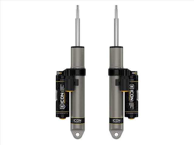 ICON Vehicle Specific (V.S.) 2.5 Aluminum Series shocks with CDEV are designed and built to give your vehicle outstanding performance off-road and a smooth ride on the street. These shocks are configured specifically for each application in both length and damping tune. For piggyback and specific remote reservoir applications, ICON'S unique use of a 6061-billet aluminum manifold a few inches below the top cap of the shock creates an internal Bump Zone that when used creates an additional 20% of damping force. This additional force helps prevent harsh bottom outs and controls the suspension when compressing at high velocity. Like all ICON'S Shock Absorbers, V.S. 2.5 Aluminum Series shocks with CDEV are fully rebuildable and re-tunable. The ICON CDE Valve upgrade is included for those desiring an easy way to tune the ride electronically from inside the vehicle.