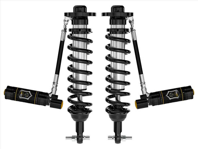 ICON Vehicle Dynamics V.S. 2.5 Series remote reservoir front coilover shocks are an incredible upgrade for the front end of the 2021-2024 Ford F-150 4WD truck. These adjustable coilovers allow up 0-2.75 of lift height adjustability, allowing the use of larger, more aggressive wheel and tire combinations. ICONs Vehicle-specific shock length and valving, their large 2.5 shock body with increased piston surface area over stock components yield the maximum travel possible along with superior ride quality and suspension performance, both on- and off-road. Remote reservoirs greatly increase shock oil volume and heat dissipation surface area to resist overheating and cavitation under hard use, which can lead to damper fade. The ICON CDE Valve upgrade is included for those desiring an easy way to tune the ride electronically from inside the vehicle. Compression Damping Electronic Valve (CDEV) is an electronically controlled valve that meters the flow of oil to regulate the amount of damping force that is created by the shock when compressed. This infinitely variable valve can react in less than 40ms and has the ability to make extremely precise adjustments for varying terrain. CDEVs hydraulic circuits are also custom tailored per application to create the highest resolution and dynamic range allowable for each specific vehicle. Powered by ICON Intelligent Control and proprietary ICON mobile app, the system uses information from the onboard G-force sensor and Gyroscope to perform calculations based on algorithms and user-defined settings to predict terrain and adjust shock settings via the CDEV accordingly. When paired with ICON 2.5 Aluminum Series CDEV rear shock absorbers, vehicle control will be balanced front to rear, resulting in the best overall driving experience for your Ford F-150 4WD.