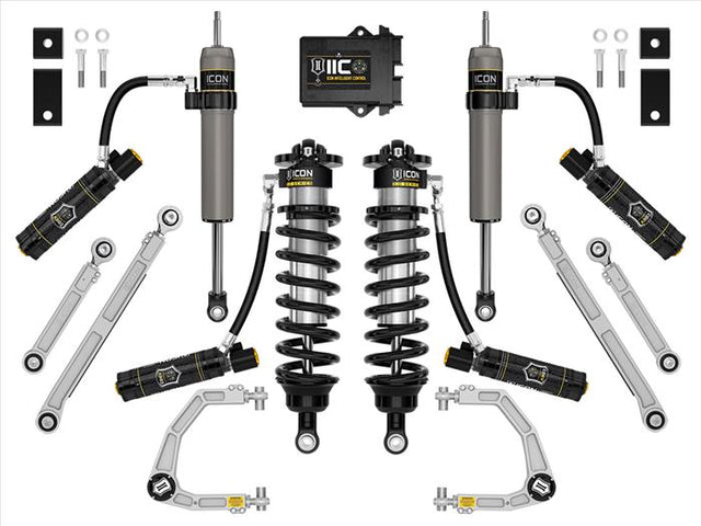 The ICON Vehicle Dynamics Stage 4 3.0 complete suspension system for the 2022-2025 Toyota Tundra builds upon the Stage 1 3.0 suspension system with the upgrade to CDEV and ICON Intelligent control (IIC) for in vehicle, active compression damping adjustment. To compliment the 3.0 Series coilover shocks, 2.5 Aluminum Series CDEV rear remote reservoir shocks are included along with billet aluminum front upper control arms and a billet rear upper/lower link combo, and a front sway bar drop kit. This system offers improved on- and off-road performance with adjustable compression damping, as well as improved alignment specs and increased front-end lift height range for a proper stance and fitment of up to 35" tires.
