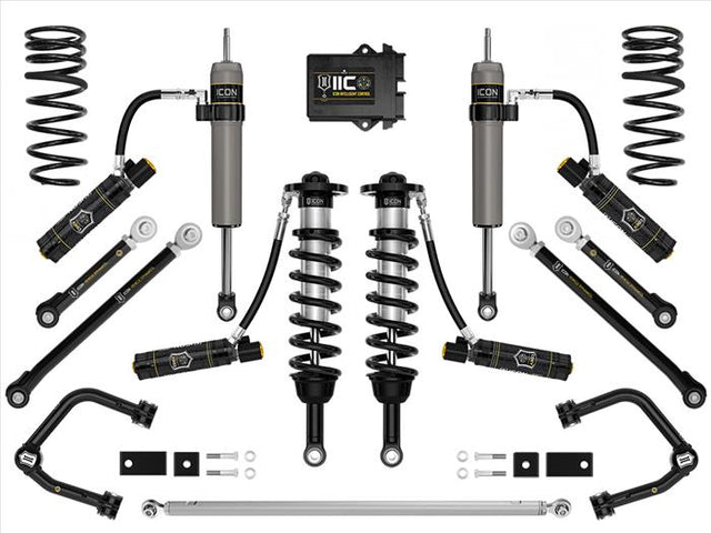 The ICON Vehicle Dynamics Stage 14 complete suspension system for the 2022-2025 Toyota Tundra builds upon the Stage 13 system with the addition of triple rate rear coils springs and an adjustable rear track bar. This system offers improved on- and off-road performance with adjustable compression damping, as well as improved alignment specs and increased front and rear-end lift height range for a proper stance and fitment of up to 35" tires. To compliment the rear coils and track bar, a 2.5 Series CDEV remote reservoir front coilover shock and tubular steel front upper control arm combo is included along with a front sway bar drop kit and 2.5 Aluminum Series CDEV rear remote reservoir shocks with billet upper and lower rear links.