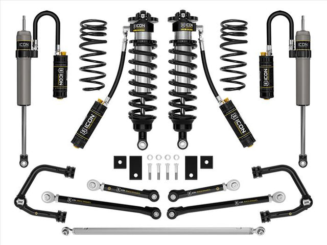 The ICON Vehicle Dynamics Stage 1 3.0 complete suspension system for the 2023-2024 Toyota Sequoia builds upon the Stage 10 2.5 suspension system with the upgrade to 3.0 Series front coilovers. This system offers improved on- and off-road performance with adjustable compression damping, as well as improved alignment specs and increased front and rear-end lift height range for a proper stance and fitment of up to 35" tires. To compliment the 3.0 Series coilover shocks, 2.5 Aluminum Series CDCV rear remote reservoir shocks are included along with tubular front upper control arms, a billet rear upper/lower link combo, a front sway bar drop kit, adjustable rear track bar, and dual rate rear coil springs.