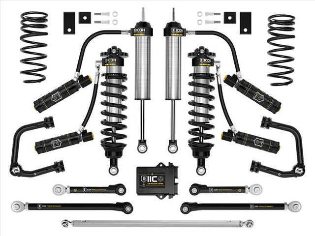 The ICON Vehicle Dynamics Stage 4 3.0 complete suspension system for the 2023-2024 Toyota Sequoia builds upon the Stage 12 2.5 suspension system with the upgrade to 3.0 Series CDEV front coilovers. This system offers improved on- and off-road performance, with active electronic shock damping adjustment, as well as improved alignment specs, improved rear articulation, and increased front-end lift height range for a proper stance and fitment of up to 35" tires.
