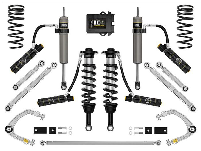 The ICON Vehicle Dynamics Stage 12 complete suspension system for the 2023-2024 Toyota Sequoia builds upon Stage 11 with the inclusion of billet rear links and track bar. This system offers improved on- and off-road performance, with active electronic shock damping adjustment, as well as improved alignment specs, improved rear articulation, and increased front-end lift height range for a proper stance and fitment of up to 35" tires. Focus on driving and let ICON Intelligent Control (IIC) read the terrain and make near-instant adjustments via the Compression Damping Electronic Valve (CDEV) at each individual shock. Control the system wirelessly through the IIC app on your phone and once configured the system functions without driver input.