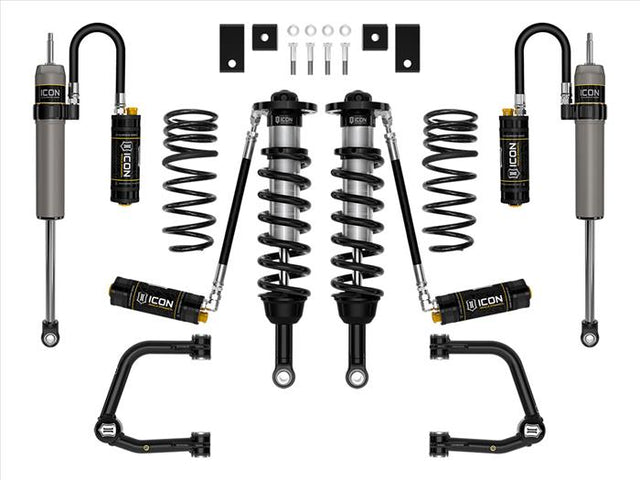 The ICON Vehicle Dynamics Stage 9 complete suspension system for the 2023-2025 Toyota Sequoia upgrades front and rear shock absorbers to include Compression Damping Control Valves (CDCV) for precisely dialing in your suspension performance. CDCV controls fluid flow under compression, allowing you to achieve the perfect tune whether driving on the street, slow crawling through the rocks or mobbing across the desert at full throttle. This system offers improved on- and off-road performance with adjustable compression damping, as well as improved alignment specs and increased front-end lift height range for a proper stance and fitment of up to 35" tires. To compliment the CDCV equipped 2.5 Series coilovers and rear shocks, a tubular steel front upper control arm kit is included along with a front sway bar drop kit and dual rate rear coil springs.