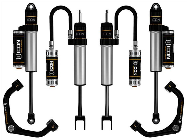 Tougher, stronger and more capable - That's the motto that General Motors used when debuting the all-new fleet of heavy-duty trucks in 2020. ICON Vehicle Dynamics stayed true to GM engineers' thought process with the development of our suspension systems for the 2020-UP GM HD 2500/3500 trucks. Using ICON's holistic engineering philosophy, our R&D team went above and beyond to develop several stages of complete suspension systems that provide varying levels of adjustability, capability, and overall vehicle performance. ICON's Stage 2 system is comprised of V.S. 2.5 Aluminum Series remote reservoir front and rear shocks, and tubular Delta Joint upper control arms. The ICON vehicle specific tuned 2.5" shocks are the key to attaining optimum ride quality and getting that desired comfort with the 3/4 & 1-ton working capability. Remote reservoirs ensure optimum performance by increasing the duration of consistent damping regardless of situation, keeping the shocks at a cooler operating temperature during heavy use. Additionally, ICON upper control arms improve alignmemt specs, add strength, durability, and when paired with extended travel shocks increases wheel travel 2" over the OEM configuration. While driving the construction site or trails to your favorite dirt bike location, ICON wants you to get there in comfort just like your drive to work.