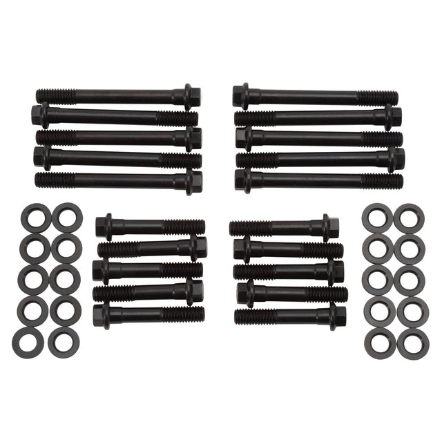 Edelbrock E-Series Cylinder Head Bolt Kit #85522 is a high-quality set of bolts for use on Ford 289-302 blocks with standard 7/16-inch head bolt bosses. This E-Series kit is a perfect choice when upgrading to Edelbrock Performer or Performer RPM Cylinder Heads. This kit includes step-washers for use with aftermarket aluminum heads using -inch head bolt holes. E-Series bolts have a yield tensile strength of 190,000 PSI for strong and reliable loading with generous filleting throughout to eliminate stress risers. Bolt threads are rolled after heat-treating for superior form and strength, while a small hex head provides extra space for socket clearance in tight situations. E-Series Cylinder Head Bolts have a durable black oxide finish with sealer and come with the distinctive Edelbrock E stamped into the head.