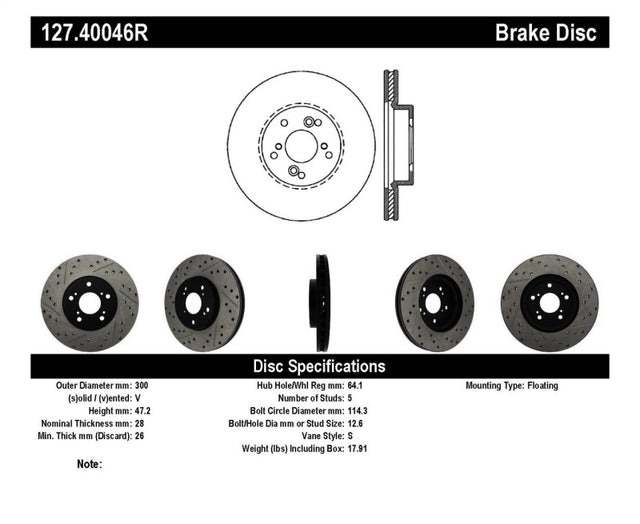 StopTech Drilled and Slotted Sport Rotors are 1-piece direct replacement brake discs for factory brake systems and stock calipers that look great behind your wheels – and offer significantly improved braking performance. The unique cross-drilling and slotting aids with heat and brake dust dispersal; prevents glazing of the pads; adds bite and improves wet and dry braking performance. Built to last; the black e-coating provides protection from corrosion and the high carbon metallurgy (in most applications) offers quieter operation; better crack resistance and increased performance.