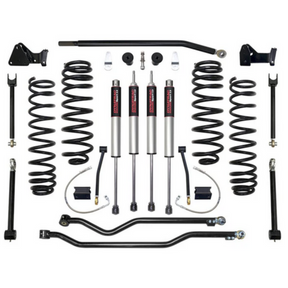 Dynatrac's 4.5" Jeep JK Suspension Lift Systems aims to strike a perfect balance between wheel travel, articulation, ground clearance, and precise on and off-road handling characteristics. With these goals met, Dynatrac-equipped JK's can take on rolling desert whoops, crawl over obstacle-riddled trails, and drive back home in comfort all in the same day. The Dynatrac Jeep JK 4.5" Suspension Lift System 2 includes dual-rate coil springs, track bar drop brackets, high-steering components, bumps top spacers, rear brake lines, rear sway bar links, adjustable front upper and rear lower links, front and rear adjustable track bars, and Dynatrac 2.0 EnduroSport shocks. Tested and tuned, the Dynatrac Jeep JK 4.5" Suspension Lift System 2 offers stability and drivability over a wide range of off-road terrains while keeping a smooth on-road feel for everyday driving. Installing this kit allows proper clearance for 35" tall tires with no modifications and 37" tires with aftermarket high clearance fenders.
