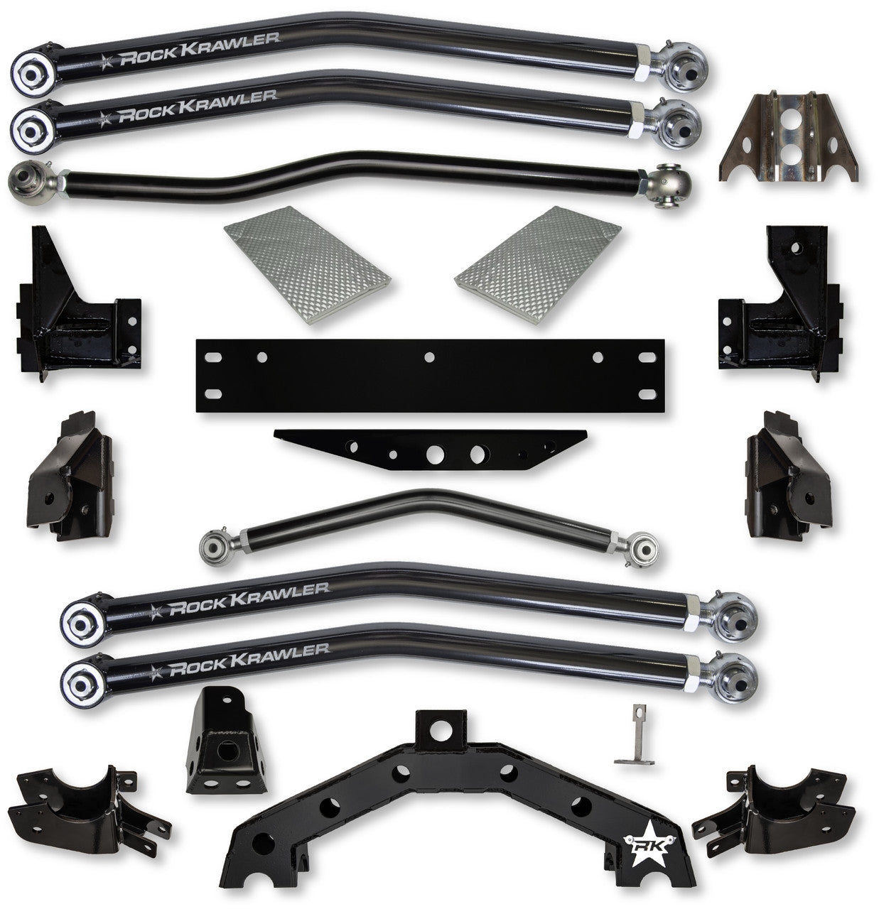 The Rock Krawler JK X Factor X2 Systems is the ultimate JK Long Arm for the trail. The X Factor systems feature 3 link rear set-up front & rear for maximum articulation and off-road performance. The rear suspension provides the tried and true independent 3 link conversion with X2 rear suspension geometry. New high clearance axle mounts provide improved ground clearance under the rear axle as compared to stock. The combination of high clearance mounts and 3 link suspension geometry lets you dominate the trails.