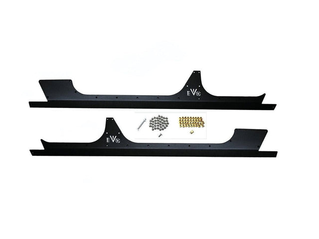 The EVO RockSkins are side armor plates are laser cut from 3/16 steel and CNC bent. They are a bolt on installation with stainless steel hardware. These can be used with all factory Jeep sliders and steps as well as all aftermarket frame mounted rock sliders. The RockSkins protection contours around stock and aftermarket fenders (factory mounting location).