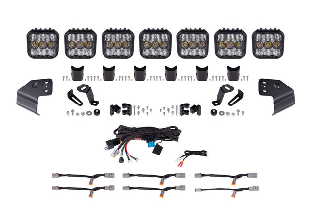Included in the box: Two (2) Application-specific heavy-duty steel brackets. Seven (7) Stage Series 5inch LED Pods. Six (6) CrossLinks with hardware. Two (2) CrossLink supports. One (1) CrossLink endmount kit. Five (5) Ultra Heavy Duty Crosslink splitters. One (1) Ultra Heavy Duty Terminating splitter. One (1) Ultra heavy-duty relay single-output harness. Installation Guide.