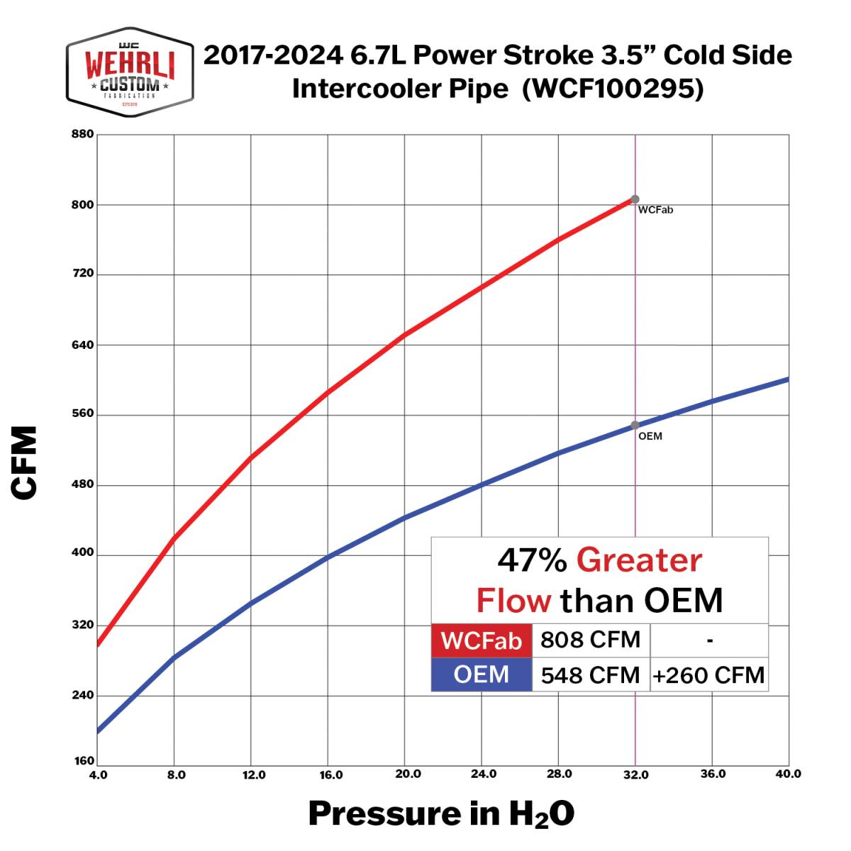 Our High Flow Intercooler Pipe Kit for the 2017-2025 Ford Super Duty equipped with the 6.7L Power Stroke improves airflow between the turbo and engine for improved efficiency, throttle response, and turbo spool up. Eliminates weak points in the factory design - like the stock rubber and plastic Cold Side Intercooler Pipe that is notorious for cracking / splitting which leads to boost leaks or complete failures in hard-working and high-performance applications.