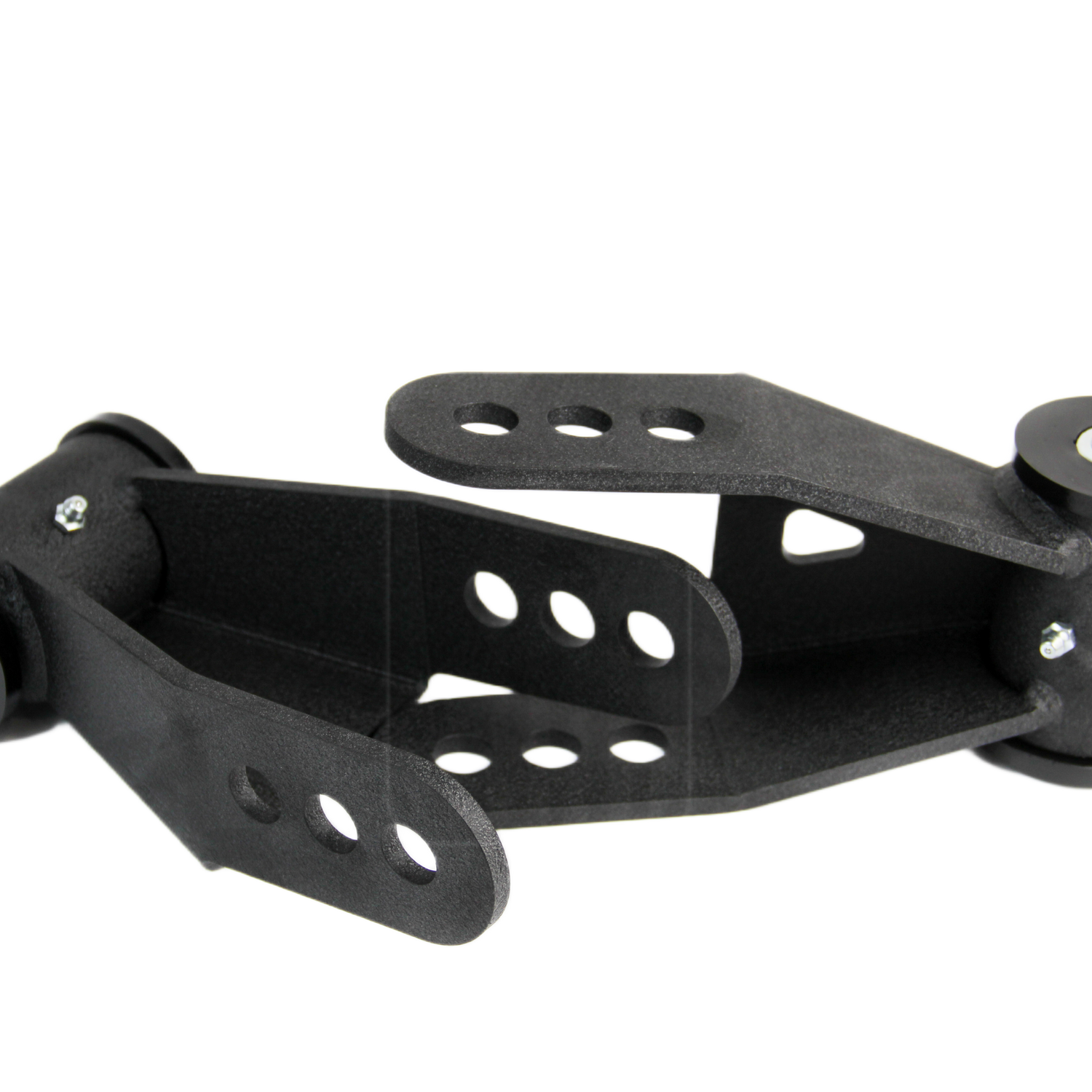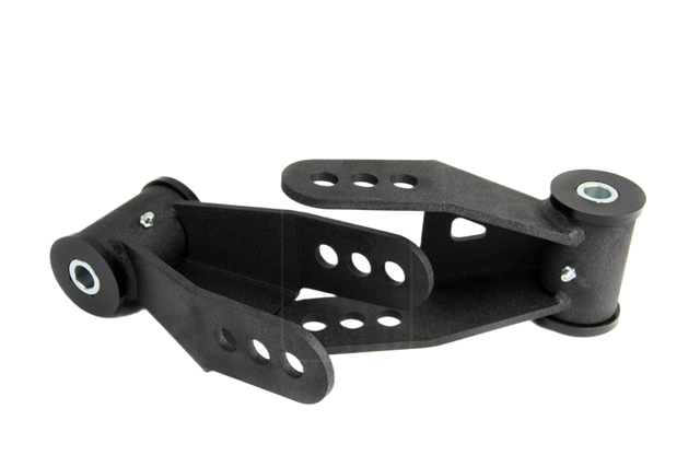 These heavy duty lowering shackles are for the rear of 1999-2022 Ford F-250/350/450 trucks, both 2wd and 4wd models.  Unlike most other lowering shackles on the market, we manufacture these from 1/4" laser cut steel and DOM tubing.  These use a Polyurethane bushing with a grease zerk and a heavy duty zinc plated inner sleeve.  With the installation of these, the user will notice a slightly softer ride do to the longer shackle allowing the leaf spring to flex a little more easily. There are 3 hole locations for the leaf which will allow the user to adjust the drop amount.  When used with OEM leaf springs, the hole locations will give you 1/4", 7/8" or 1.25" of drop.  Aftermarket leaf springs may respond differently.  These bolt in using OEM hardware.  Payload is not affected.  These come standard in a powder coated finish.  As always these are proudly manufactured in house here in the wonderful USA!