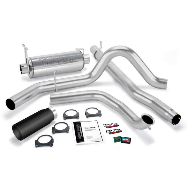Amplify your truck's performance at the friendliest price around! Gain up to +50 hp/+88 lb-ft 8 Percent more towing MPG Black tipPickup: Banks Git-Kit produces rear-wheel gains up to +50 hp, +88 lb-ft torque and saves you an average of 8 percent in fuel when you're toting something heavy behind you. Maintains safe EGTs to preserve engine durability. Fitment Notes: Important - Some vehicle configurations require an extension kit for proper fit. 1999 Power Stroke variations: Ford trucks for model year 1999 fall into three categories: 1999, early 1999.5, late 1999.5. It is important to know the specific model. Check the build date on the tag inside the driver's door, then match: 1999 model year (built prior to 1/99 with catalytic converter), Early 1999.5 model year (built prior to 1/99, no catalytic converter, intake manifold has 2 inch-diameter inlets), Late 1999.5 model year (built on or after 1/99, no catalytic converter, intake manifold has 3 inch-diameter inlets). 1999-2003 F-350 cab-and-chassis (no bed) trucks: If fuel tank is behind rear axle of the vehicle, use systems for F-450/550 trucks. 1999-2003 pickups other than standard-cab long-bed or extended-cab short-bed require Exhaust Extension Kit. Git-Kit not available for 2001-2003 (275 hp) pickups.Git-Kit Bundle, Power System with Single Exit Exhaust, Chrome or Cerakote Black Tip for use with 2001-2003 Ford 7.3L F250/F350, With Catalytic Converter