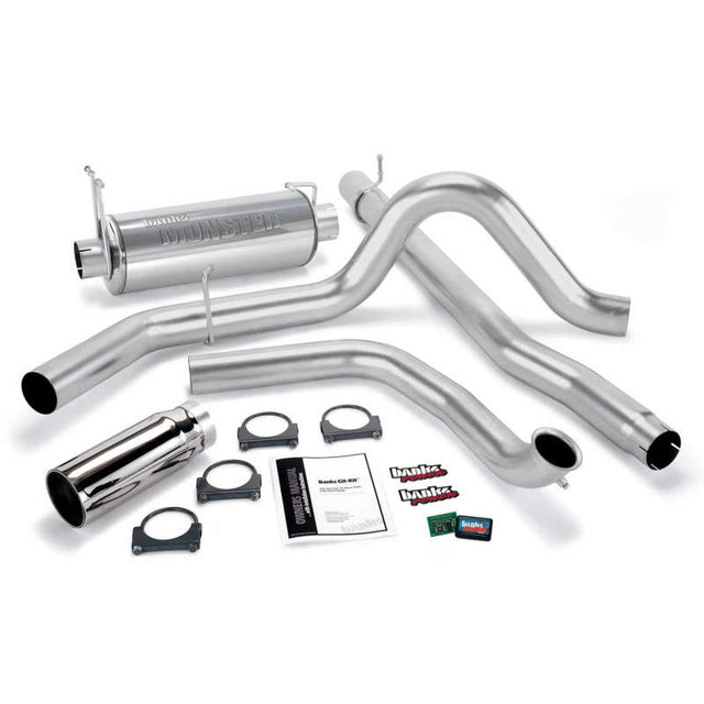 Amplify your truck's performance at the friendliest price around! Gain up to +50 hp/+88 lb-ft 8 Percent more towing MPG Chrome tip Pickup: Banks Git-Kit produces rear-wheel gains up to +50 hp, +88 lb-ft torque and saves you an average of 8 percent in fuel when you're toting something heavy behind you. Maintains safe EGTs to preserve engine durability. Fitment Notes: Important - Some vehicle configurations require an extension kit for proper fit. 1999 Power Stroke variations: Ford trucks for model year 1999 fall into three categories: 1999, early 1999.5, late 1999.5. It is important to know the specific model. Check the build date on the tag inside the driver's door, then match: 1999 model year (built prior to 1/99 with catalytic converter), Early 1999.5 model year (built prior to 1/99, no catalytic converter, intake manifold has 2 inch-diameter inlets), Late 1999.5 model year (built on or after 1/99, no catalytic converter, intake manifold has 3 inch-diameter inlets). 1999-2003 F-350 cab-and-chassis (no bed) trucks: If fuel tank is behind rear axle of the vehicle, use systems for F-450/550 trucks. 1999-2003 pickups other than standard-cab long-bed or extended-cab short-bed require Exhaust Extension Kit. Git-Kit not available for 2001-2003 (275 hp) pickups.Git-Kit Bundle, Power System with Single Exit Exhaust, Chrome or Cerakote Black Tip for use with 1999 Ford 7.3L F250/F350, with Catalytic Converter