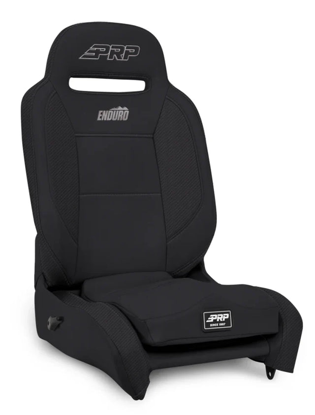 The Enduro Elite is our newest Reclining Suspension Seat, now with Elite Series styling. Designed to replace stock Jeep Wrangler, Jeep XJ, or truck seats, the Enduro supplies additional comfort for taking your daily driver off-roading. Included is a removable, contoured seat cushion for better leg support and longer comfort. The vinyl-coated nylon suspension liner and dual-density foam decrease the impact on the body, reducing the fatigue you feel after a long day in the dirt or dunes. The Enduro Elite reclines completely and inclines enough to allow access to the rear seats. The bottom tabs easily bolt to PRP’s series of mounts built for Jeep, Broncos, Ford Rangers, and more. The seat features a Vinyl Center, Vinyl Back and Vinyl Bands.
