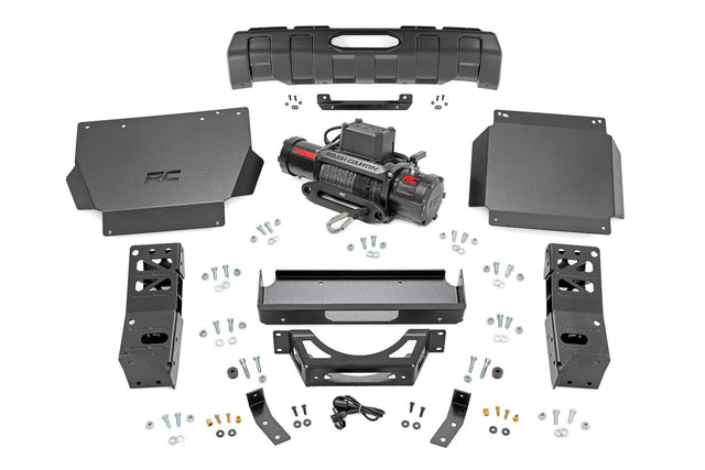 Hidden Strength, Visible Performance: Upgrade your fourth-generation Toyota Tacoma with Rough Country's Hidden Winch Mount Kit, delivering discreet power, rugged durability, and a clean, factory-style finish. Perfect for off-road recovery without compromising style.Stealthy Winch Integration: Designed for Rough Country's PRO9500S and PRO12000S winches, this hidden mount tucks recovery power behind the front fascia, creating a streamlined, low-profile appearance.Maximum Protection: The included differential skid plate shields vital drivetrain components, giving you confidence on rugged trails. The front skid plate also features a laser-cut Rough Country logo for a signature touch of style.Heavy-Duty Construction: Built for extreme durability, the 7-gauge steel winch tray and mounts provide rock-solid support, while 11-gauge steel skid plates offer reinforced undercarriage protection against tough terrain.OEM-Style Front Fascia: A new front fascia replaces the factory unit, maintaining a clean, seamless look while concealing the winch system without compromising your Tacoma's refined design.Effortless Installation: Hit the trails sooner with a bolt-on structural design that makes installation quick and hassle-free. Bumper wing supports mount directly to factory intrusion bars for a secure, factory-like fit.Trail-Ready Performance: Rough Country's Hidden Winch Mount Kit for the Toyota Tacoma combines stealth, strength, and functionality in one low-profile package, giving your truck the ultimate off-road capability.