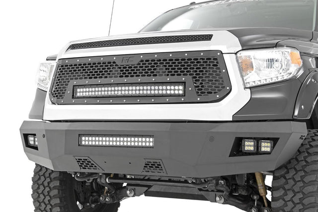 Give the front-end of your Toyota Tundra a unique look with Rough CountryΓÇÖs Mesh Grille kit. This grille replacement kit swaps out your stock grille with the eye-catching, head-turning good looks of this aftermarket upgrade. With a unique, laser-cut mesh pattern surrounded by stylish, stainless steel button-head bolts, this grill gives your truck a more menacing look thatΓÇÖs sure to draw attention. Each kit is powder coated black to resist corrosion and give a long lifespan of good looks.This kit features a Rough Country's 30ΓÇ¥ Curved Dual-Row Black-Series LED light bar with Cree LED's outputting tremendous lighting power. Includes a mountable on/off switch, wiring harness, and our 3 Year Warranty!\