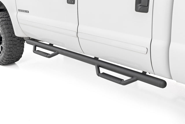 Climbing into your truck should never feel like a workout. With Rough Country's all-new bolt-on Nerf Steps, getting in and out is a breeze. Experience effortless access and elevate your truck with a sleek, durable upgrade.Enhanced Undercarriage Protection: Say goodbye to road debris, rocks, and obstacles that could damage your undercarriage. Our Nerf Steps act as a shield, protecting your vehicle from the harsh elements below.Integrated Stone Guards for Added Protection: Keep your Ford looking like new. The built-in stone guards effectively deflect kicked-up rocks and debris, preserving your vehicle's paint job from potential damage.Sleek, Streamlined Design: No bulky bars here, just a clean, high and tight profile that follows your cab's contours. These Nerf Steps provide a polished, streamlined look that enhances your truck's rugged yet refined style.Built to Endure: Crafted from .084 wall, corrosion-resistant tubing, these Nerf Steps are engineered to withstand anything the road or trail throws at them. From muddy trails to harsh environments, they'll handle it all while staying tough and reliable.Quick and Easy Installation: No drilling required, just bolt them on and enjoy a hassle-free installation. Spend less time working and more time exploring with this straightforward, user-friendly design.Limited Lifetime Warranty: Backed by Rough Country's Limited Lifetime Warranty, these Nerf Steps provide lasting durability and peace of mind for years to come.Step up your truck's style and protection with Rough Country Nerf Steps. Easy installation, superior defense, and a sleek, high-end design, everything you need to take your vehicle to the next level.