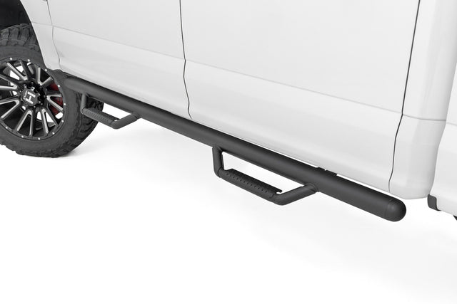 Climbing into your truck should never feel like a workout. With Rough Country's all-new bolt-on Nerf Steps, getting in and out is a breeze. Experience effortless access and elevate your truck with a sleek, durable upgrade.Enhanced Undercarriage Protection: Say goodbye to road debris, rocks, and obstacles that could damage your undercarriage. Our Nerf Steps act as a shield, protecting your vehicle from the harsh elements below.Integrated Stone Guards for Added Protection: Keep your Ford looking like new. The built-in stone guards effectively deflect kicked-up rocks and debris, preserving your vehicle's paint job from potential damage.Sleek, Streamlined Design: No bulky bars here, just a clean, high and tight profile that follows your cab's contours. These Nerf Steps provide a polished, streamlined look that enhances your truck's rugged yet refined style.Built to Endure: Crafted from .084 wall, corrosion-resistant tubing, these Nerf Steps are engineered to withstand anything the road or trail throws at them. From muddy trails to harsh environments, they'll handle it all while staying tough and reliable.Quick and Easy Installation: No drilling required, just bolt them on and enjoy a hassle-free installation. Spend less time working and more time exploring with this straightforward, user-friendly design.Limited Lifetime Warranty: Backed by Rough Country's Limited Lifetime Warranty, these Nerf Steps provide lasting durability and peace of mind for years to come.Step up your truck's style and protection with Rough Country Nerf Steps. Easy installation, superior defense, and a sleek, high-end design, everything you need to take your vehicle to the next level.