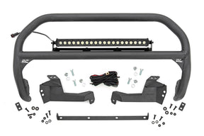 Rough Country's Nudge Bar can be equipped with four round LED lights, or a single row 20" LED light bar! Rough CountryΓÇÖs all-weather LED lights feature a durable, die-cast aluminum housing and include a premium, waterproof, flat-wound, braided wiring harness with toggle switch and in-line fuse.