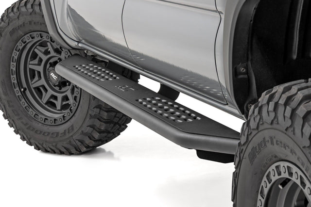 Rough Country's OV2 running board is the perfect combination of off-road style and function. These heavy-duty steel steps feature a rugged tubular construction for strength and rocker panel protection while still boasting a large area for secure footing. With rugged construction and easy installation, it's time to elevate your Toyota Tacoma's performance and style.Rugged Durability: Made from durable steel and wrapped with a tubular side wall, the OV2 Running Boards offer reliable protection against rocks and debris the trail throws your way. The 1-3/4 inch steel tubing provides added body protection, ensuring your Tacoma stays in top condition no matter where you go.Ample Stepping Area: With a generous 6-3/4-inch-wide stepping area, these running boards offer plenty of foot room, making it easy to enter and exit your Tacoma, even with mud-caked boots.Corrosion Resistance: Finished with a durable powder coat, our running boards are built to withstand the elements and resist corrosion, so they'll look great for years to come.Easy Installation: Say goodbye to complicated installations. The OV2 Running Boards feature a no-drill installation process, allowing you to equip your Tacoma for off-road adventures without the hassle.Peace of Mind: Rough Country stands behind the OV2 Running Boards with a limited lifetime warranty, so you can trust that our boards are a reliable investment for your Tacoma.Whether you're navigating rocky trails or cruising through mud and sand, these running boards are the ultimate off-road companion, providing a sure step and unmatched protection for your rig.