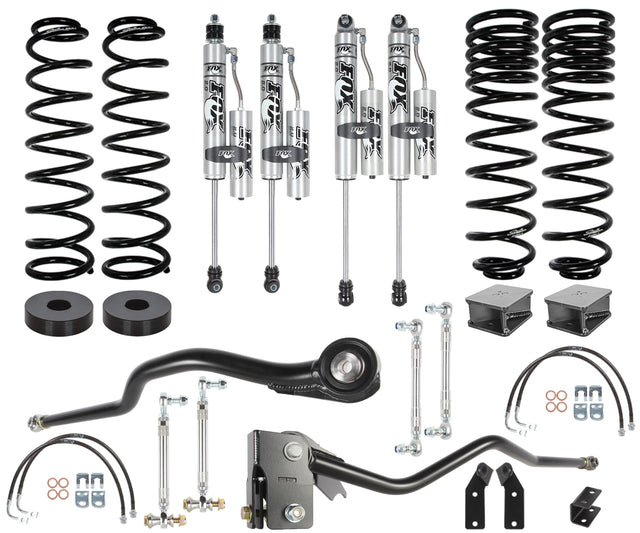 When lifting the front end of a straight axle vehicle, the front axle is pulled off-center unless the proper linkages are addressed. This system includes an Adjustable Track Bar that’s designed to extend – we provide this measurement – to correct the driver’s side axle shift. Included in the system, we provide extended sway bar end links with spherical bearings to accommodate the extended travel and maintain the factory Rubicon Sway Bar Disconnect. The last piece of the puzzle; extended stainless brake lines ensure the bottom of the new travel stroke can be reached without ancillary component stress. A short billet bump riser is included to match the front shock travel.